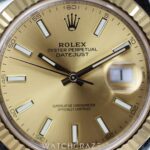 The champagne dial of the Datejust is a canvas of luxury, its sunburst finish casting a warm, golden glow that captivates with every glance. The dial’s texture and color create a dynamic interplay of light, while the bold Roman numerals and luminescent markers provide a touch of classic charm. The date window, framed by the iconic Cyclops lens, magnifies the date with clarity and grace, seamlessly integrating functionality with design.